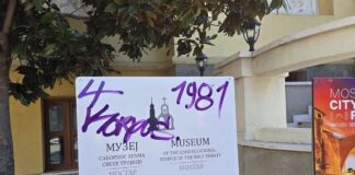 Grafiti „4. korpus“ i „1981“ na tabli ispred Vladičanskog dvora u…
