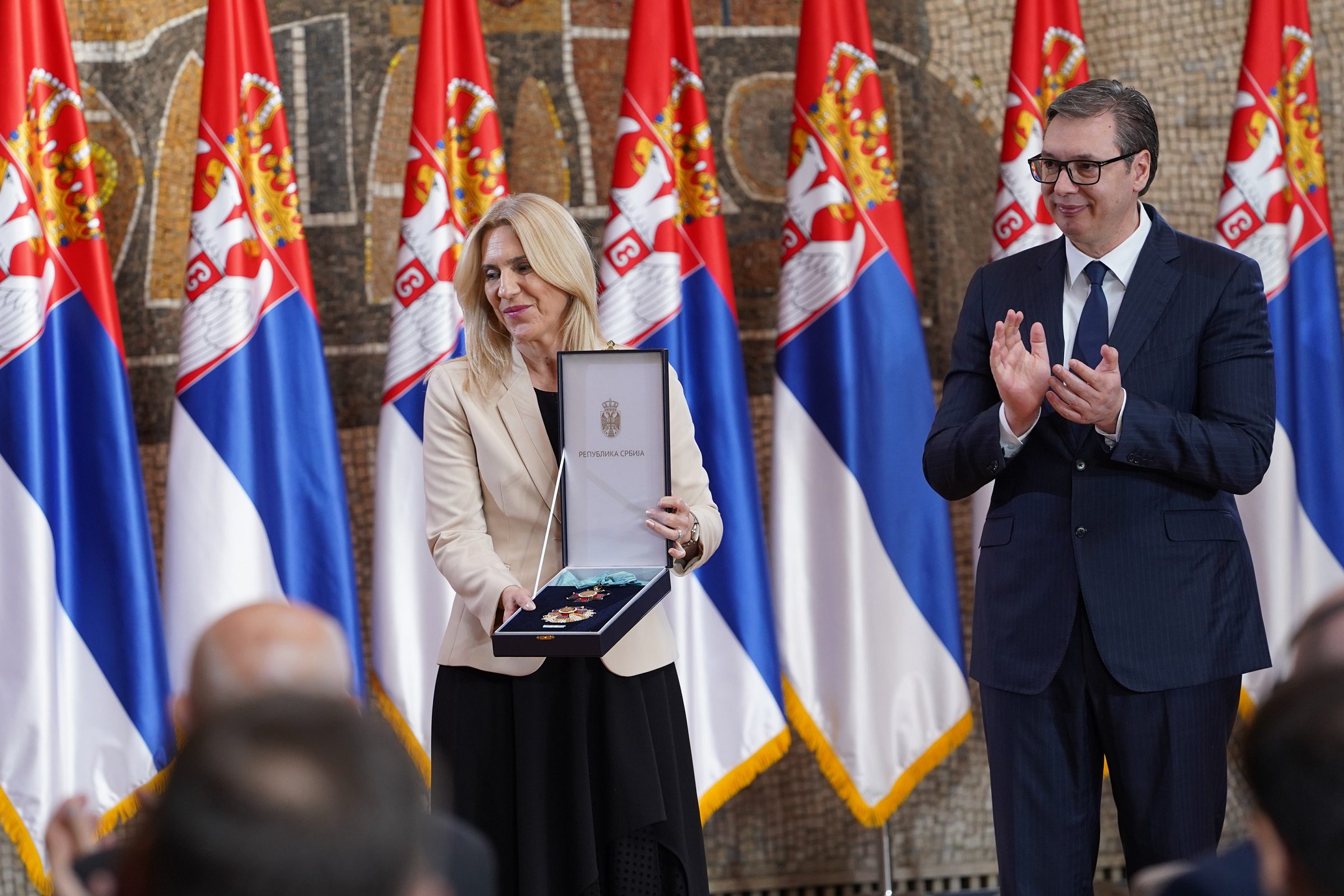 Vučić je danas povodom Dana državnosti Srbije – Sretenja, uručio Orden Republike Srbije na lenti predsjedniku Republike Srpske Željki Cvijanović za izuzetne zasluge u razvijanju i učvršćivanju miroljubive saradnje i prijateljskih odnosa između Srbije i Srpske.