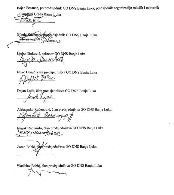 Kriza u kojoj se nalazi čitav svijet pa i mi, obavezuje nas da se ponašamo odgovorno. Pošto to nije moguce u okviru DNS, mi dolje potpisani članovi Predsjedništva GO DNS Banjaluke, istupamo iz članstva stranke.