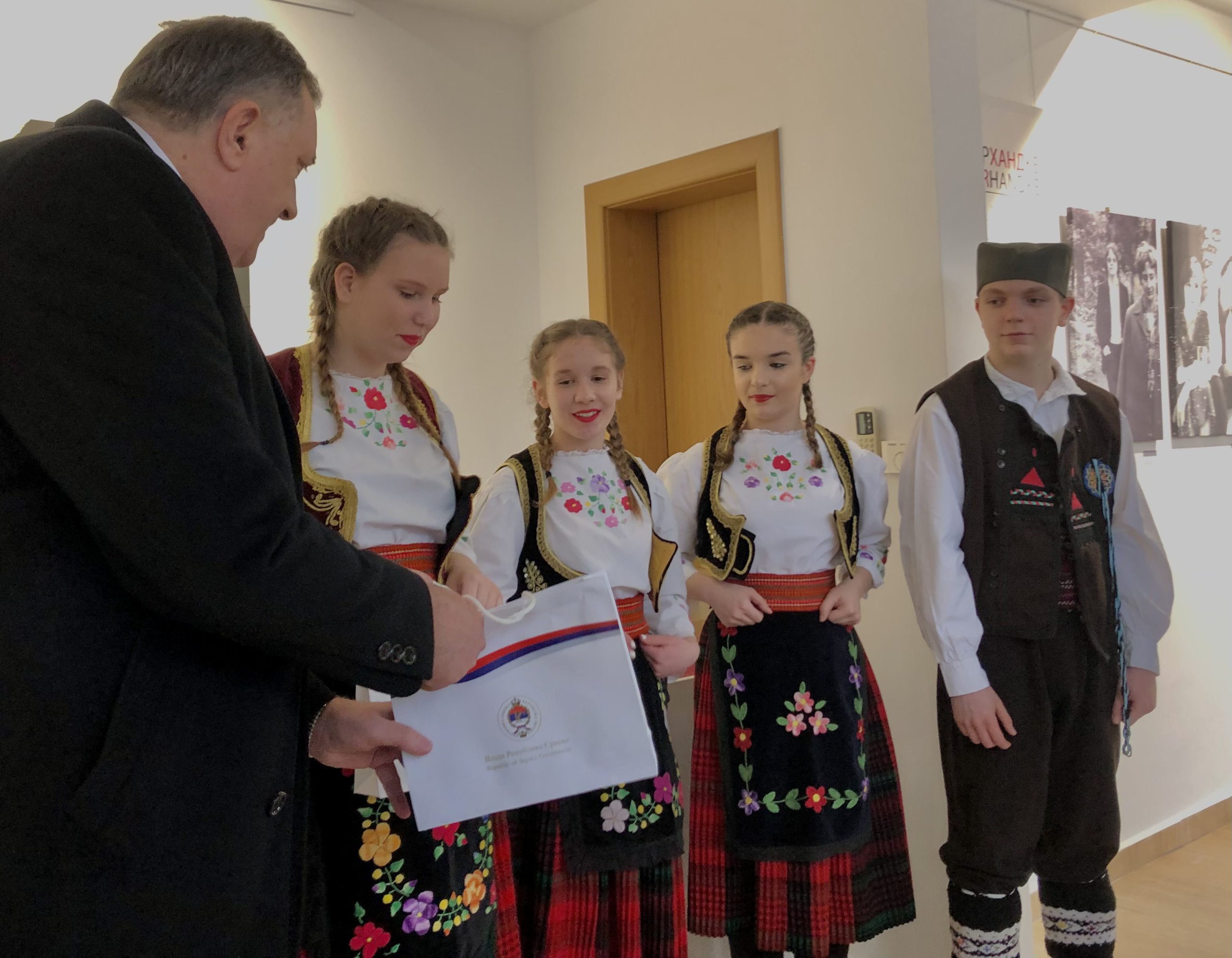 Djeca, obučena u tradicionalne srpske nošnje, uručila su gostima prigodne poklone. Ni za njih nisu izostali pokloni, koje im je uručio Dodik.