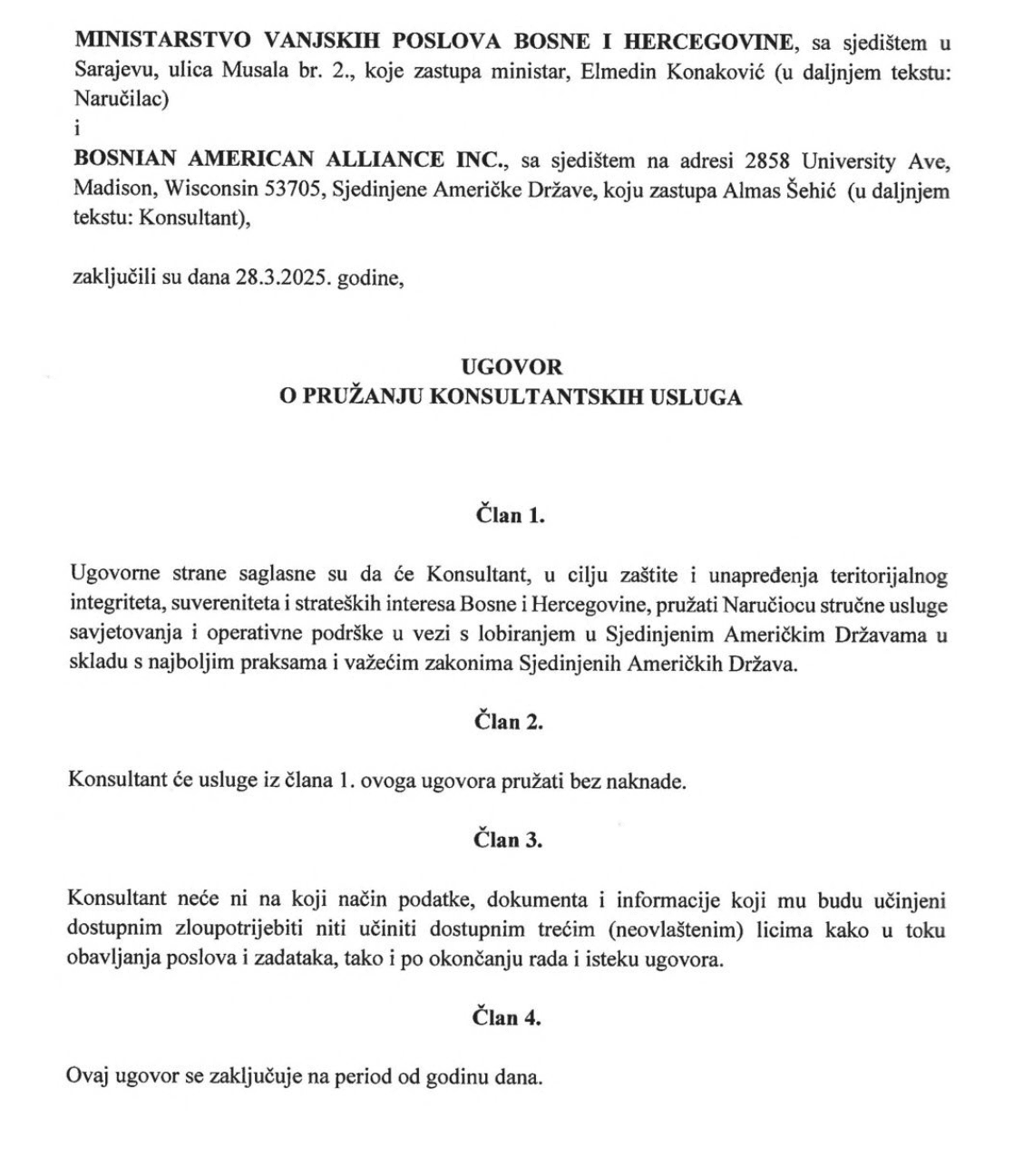 Ministar inostranih poslova u Savjetu ministara Elmedin Konaković potpisao je 28. marta ispred ovog ministarstva ugovor sa lobističkom kućom „Bosnijan Amerikan alajans“ iz Sjedinjeni Država, navodi se u dokumentima američke administracije, čije su faksimile objavili federalni mediji.