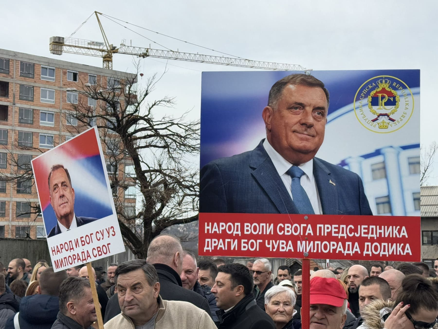 Okupljeni nose transparente na kojima su ispisane poruke podrške predsjedniku Republike Srpske.