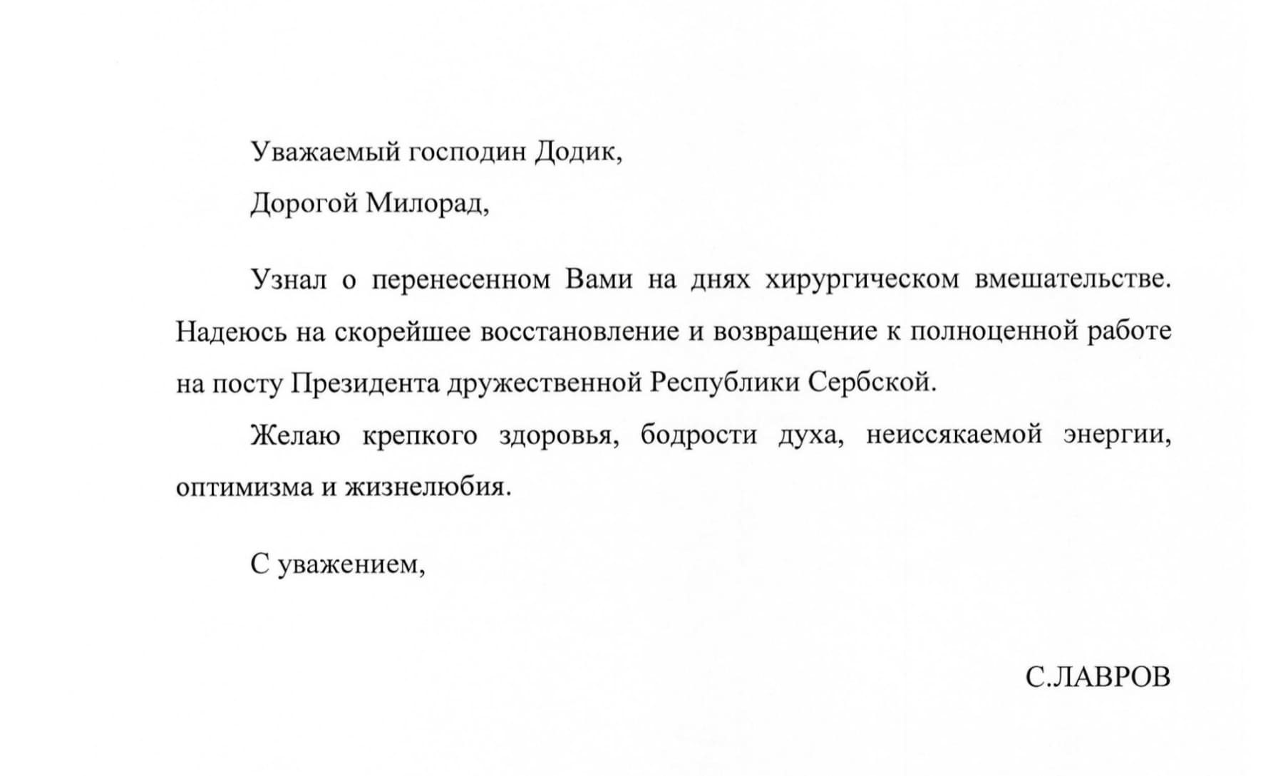 – Dragi Milorade, informisan sam o hirurškoj intervenciji koju ste prošli prije nekoliko dana. Nadam se brzom oporavku i povratku radu u punom kapacitetu na poziciji predsjednika prijateljske Republike Srpske – naglasio je ministar Lavrov.