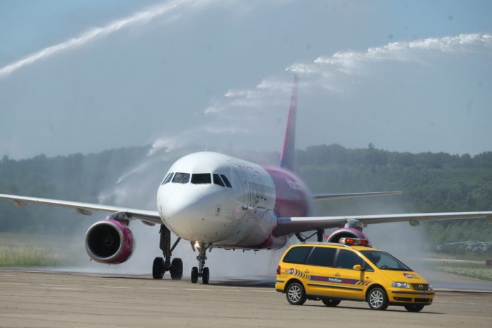 Kao znak velike dobrodošlice avion jedne od najznačajnijih evropskih niskotarifnih avio-kompanija „Viz er“ dočekan je vodenim topovima.