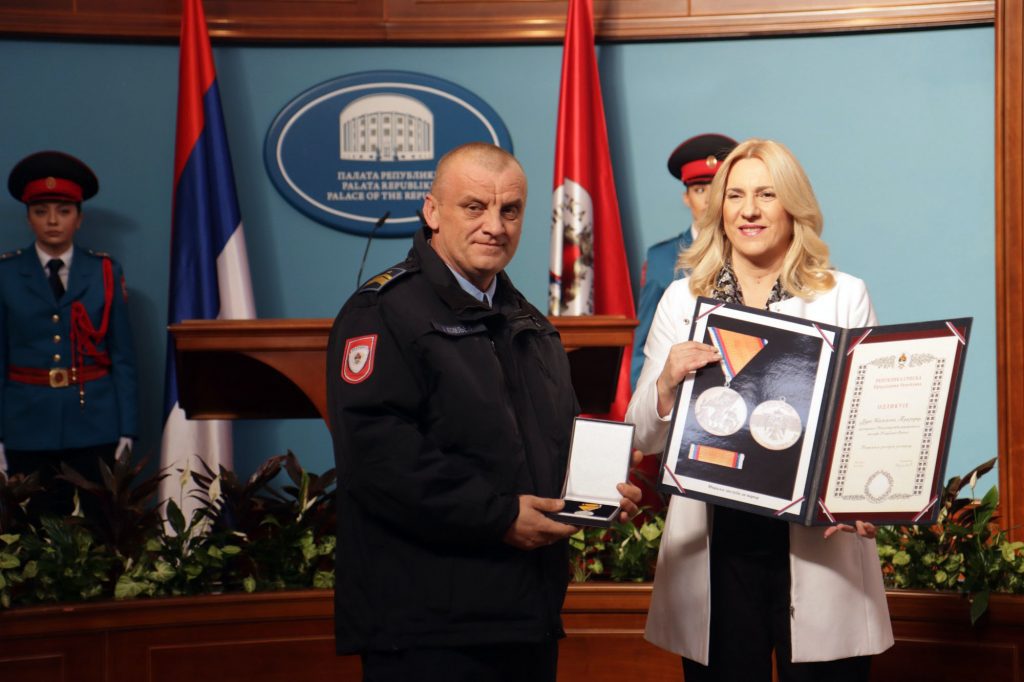 Medaljom zasluga za narod – za doprinos u oblasti humanitarnog i duhovnog rada, ispoljavanje lične hrabrosti, vrhunska dostignuća u oblasti sporta, kulture i umjetnosti, kojima se sveukupno doprinosi opštoj afirmaciji Republike Srpske, odlikovani su pripadnici Ministarstva unutrašnjih poslova Srpske Vedran Petrović iz Bijeljine i Juro Komljen iz Prijedora.