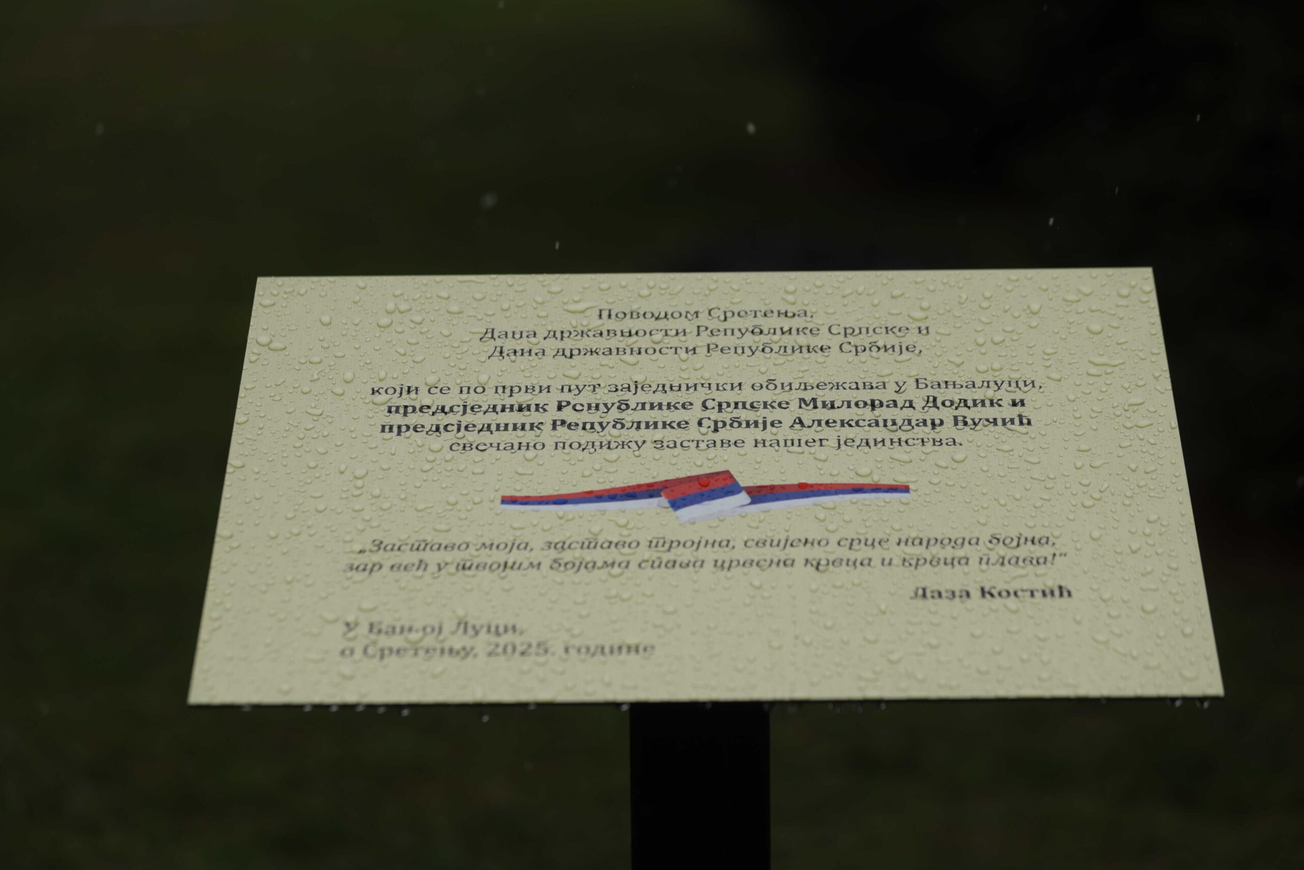 Pored jarbola istaknuta je i ploča na kojoj piše da predsjednici Srpske i Srbije svečano podižu zastave srpskog jedinstva povodom Sretenja, Dana državnosti Republike Srpske i Dana državnosti Srbije, koji se prvi put zajednički obilježava u Banjaluci.