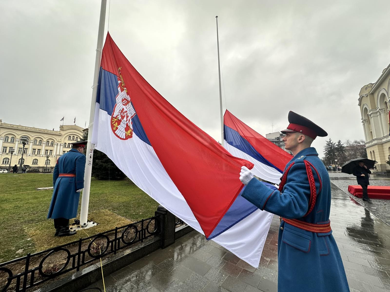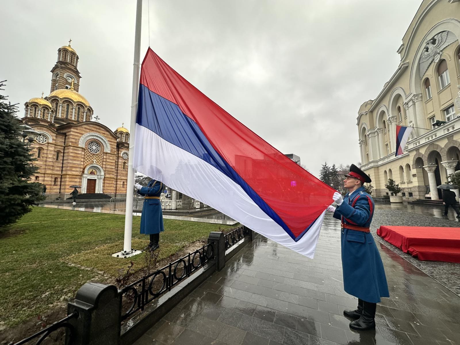 Predsjednik Republike Srpske Milorad Dodik i predsjednik Srbije Aleksandar Vučić poklonili su se zastavama dvije zemlje koje su svečano podignute na dva jarbola ispred Palate Republike u Banjaluci.