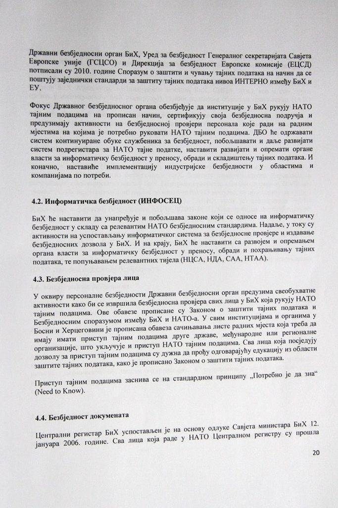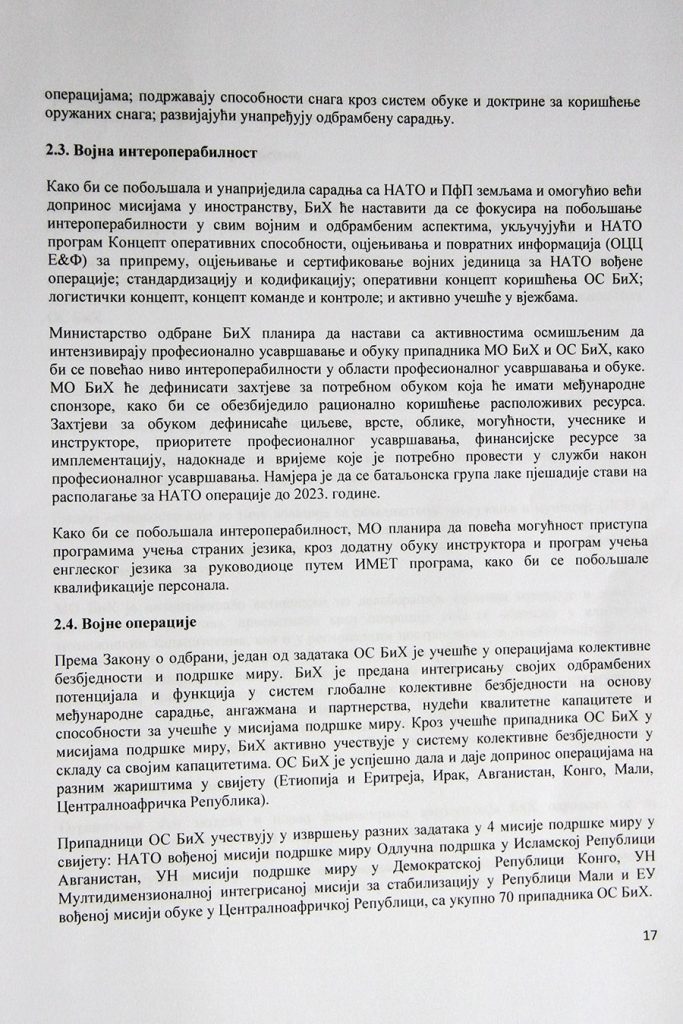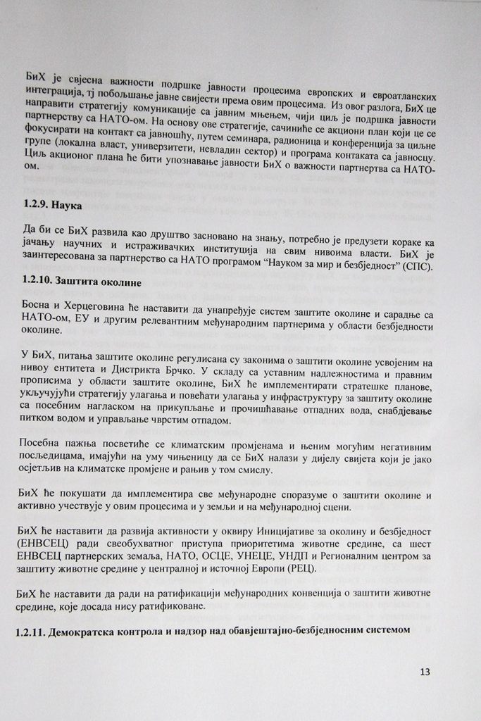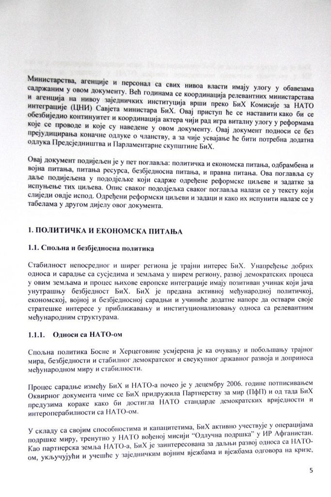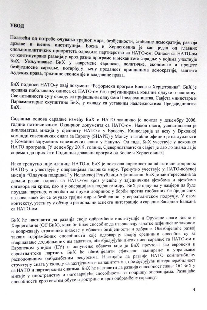 – Odnosi sa NATO se kontinuirano razvijaju kroz razne programe i mehanizme saradnje u kojima učestvuje BiH. Uključivanje BiH u savremene ekonomske, evropske, političke, i procese bezbjednosne saradnje, potvrđuju njenu predanost principima demokratije, zaštite ljudskih prava, tržišne ekonomije i vladavine prava. BiH podnosi NATO-u ovaj dokument „Program reformi Bosne i Hercegovine“. BiH je predana poboljšanju odnosa sa NATO, bez prejudiciranja konačne odluke o članstvu. Sve aktivnosti su u skladu sa prijašnjim odlukama Predsjedništva, Savjeta ministara i Parlamentarne skupštine BiH, u skladu sa ustavnim nadležnostima Predsjedništva BiH – piše u Programu reformi.