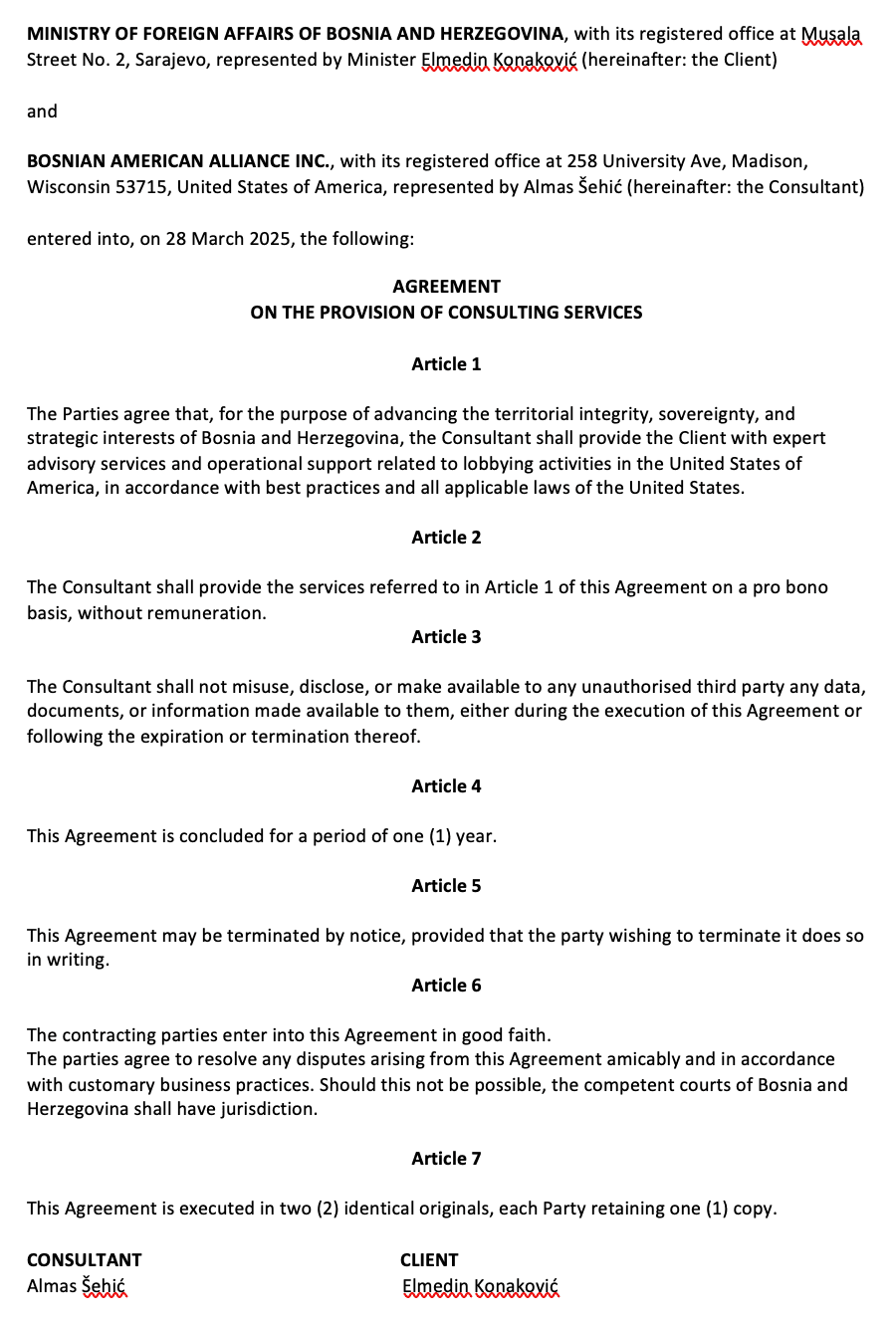 „Strane su“, piše u ugovoru između Konakovića i lobiste Almasa Šehića, „saglasne da će, u svrhu unapređenja teritorijalnog integriteta, suvereniteta i strateških interesa Bosne i Hercegovine, konsultant (Šehić) klijentu (Konakoviću) pružiti stručne savjetodavne usluge i operativnu podršku u vezi s aktivnostima lobiranja u Sjedinjenim Američkim Državama, u skladu s najboljom praksom i svim važećim zakonima Sjedinjenih Američkih Država“. U ugovoru je dalje navedeno da će ove usluge biti obavljane – „bez naknade“.