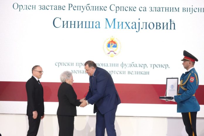 Predsjednik Republike Srpske Milorad Dodik odlikovao je posthumno Sinišu Mihajlovića, srpskog profesionalnog fudbalera, trenera, menadžera i sportskog velikana, Ordenom zastave Republike Srpske sa zlatnim vijencem.