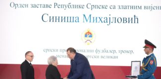 Siniši Mihajloviću Orden zastave Srpske sa zlatnim vijencem, odlikovanje uručeno njegovoj...