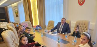 Predsjednik Republike Srpske Milorad Dodik objavio je fotografiju sa svojim unučićima, ističući da je danas u svom kabinetu imao čast da primi najdražu delegaciju.