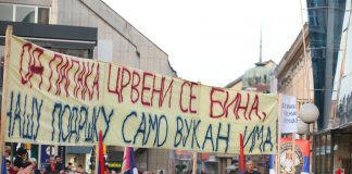 Na protestu opozicije na Trgu Krajine, dignut je transparent na kojem piše "Od papaka crveni se bina, našu podršku samo Vukan ima".