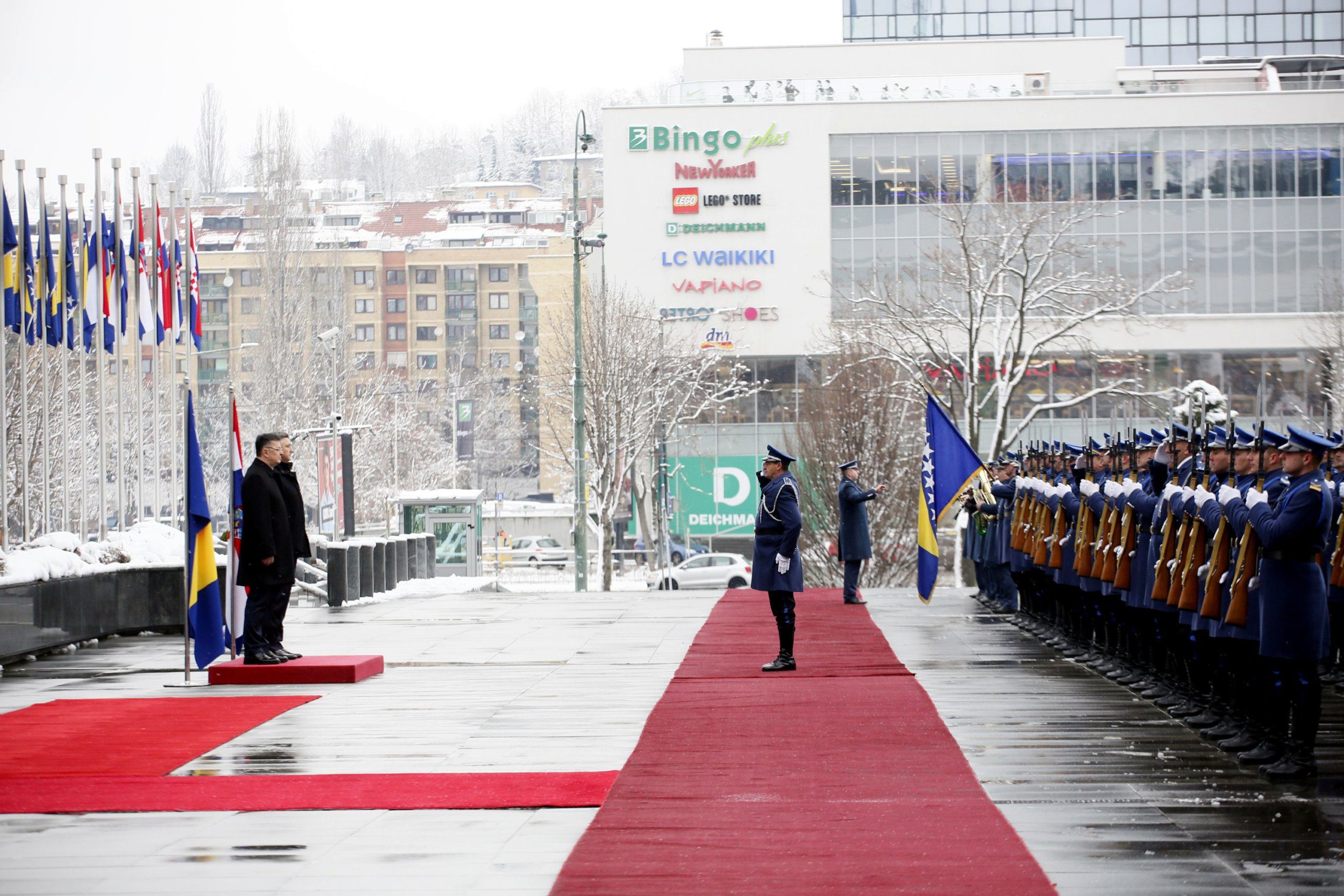 Predsjedavajući Savjeta ministara Zoran Tegeltija jutros je na platou ispred zgrade institucija u Sarajevu svečano dočekao predsjednika Vlade Hrvatske Andreja Plenkovića, koji je doputovao u službenu posjetu BiH.
