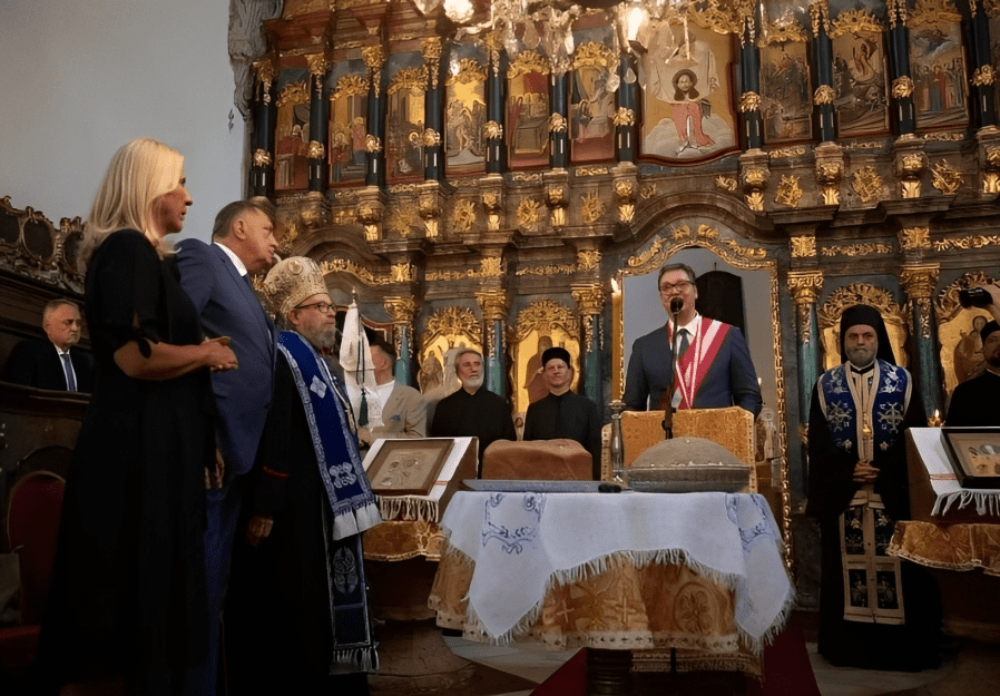 Predsjednik Republike Srpske Milorad Dodik, srpski član Predsjedništva BiH Željka Cvijanović i predsjednik Srbije Aleksandar Vučić danas su prisustvovali liturgiji i lomljenju slavskog kolača povodom Preobraženja Gospodnjeg – krsne slave Preobraženske crkve u Sentandreji i tom prilikom Dodik je uručio Orden vladici budimskom Lukijanu.