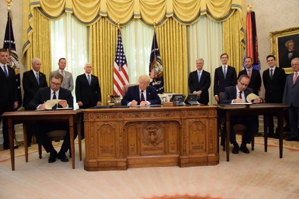 Tramp je nakon sastanka sa Vučićem i predstavnikom Prištine Avdulahom Hotijem naveo da je Srbija posvećena da prebaci svoju Ambasadu u Jerusalim, te da su se Priština i Izrael saglasili da normalizuju odnose i ustanove diplomatske odnose.