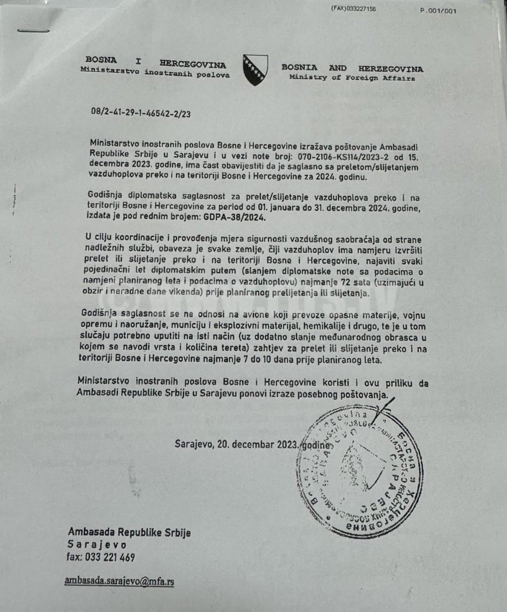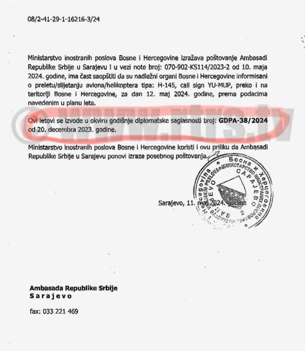 RTRS je takođe u posjedu dokumenta Ministarstva inostranih poslova BiH, u kojem se vidi da ovo ministarstvo izražava poštovanje Ambasadi Srbije u Sarajevu u vezi note od 10. maja 2024. godine, te da saopštava da su nadležni organi BiH informisani o preletu/slijetanju aviona/helikoptera na teritoriji BiH za 12. maj 2024. godine.